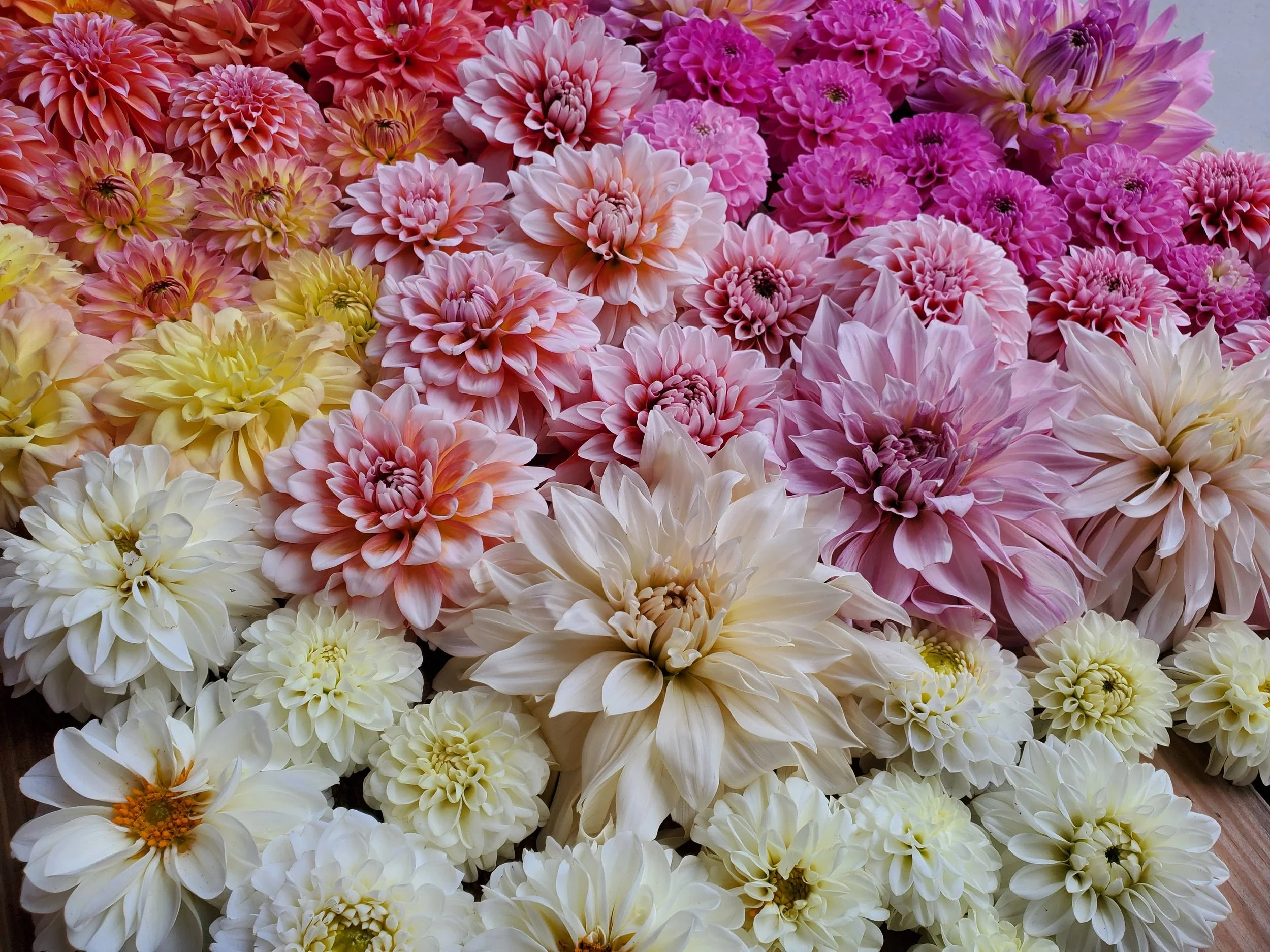 Our availability of over 200 varieties of florals run from early spring to late autumn. Spring starts with tulip, daffodils, anemones, and ranunculus. Next come our sunflowers, zinnias, lisianthus, and many more which make up our summer offerings. We finish our growing season with over 75 types of dahlias, heirloom chrysanthemums, and ornamental cabbage.