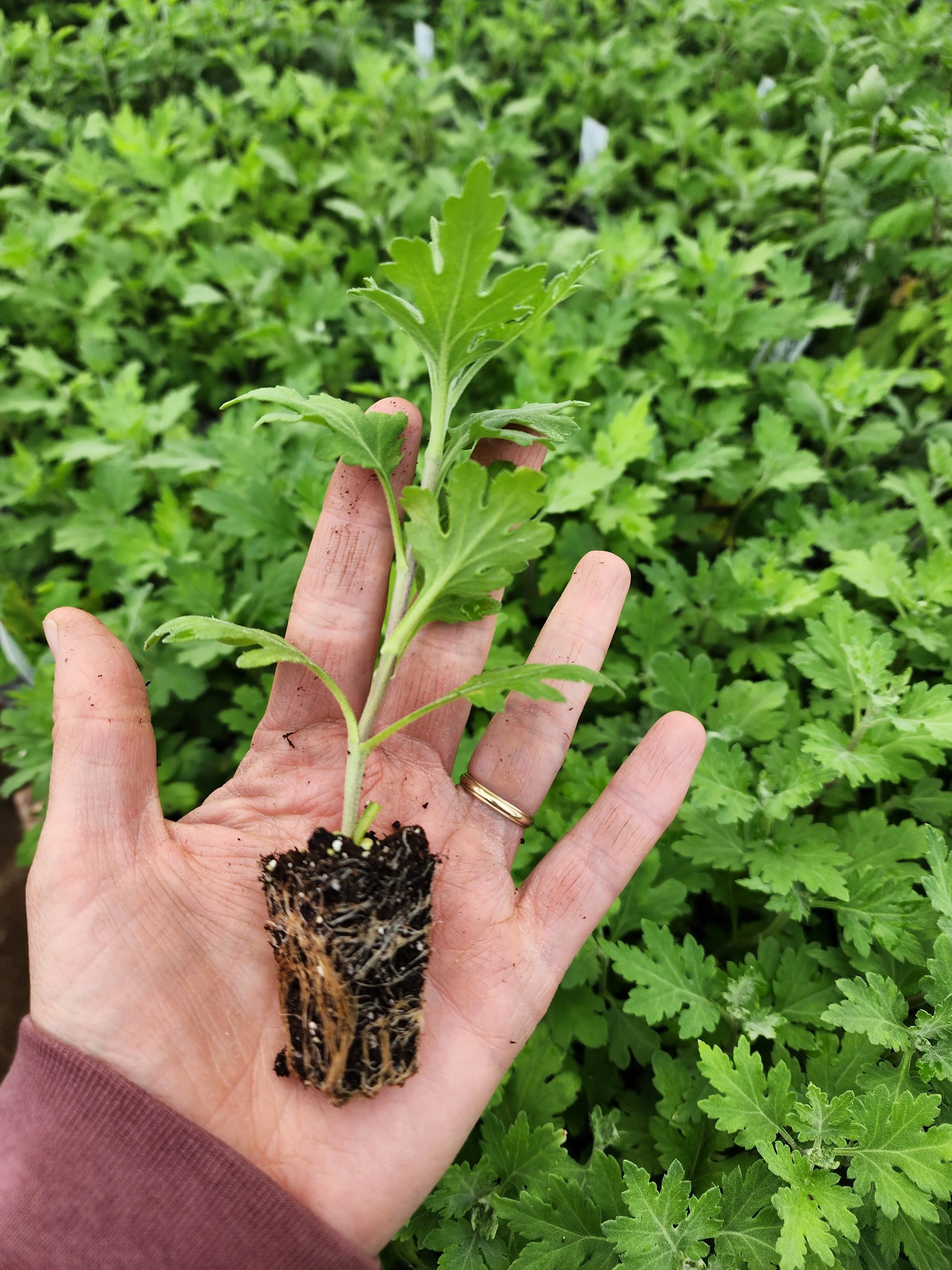 A rooted heirloom chrysanthemum ready to be shipped.